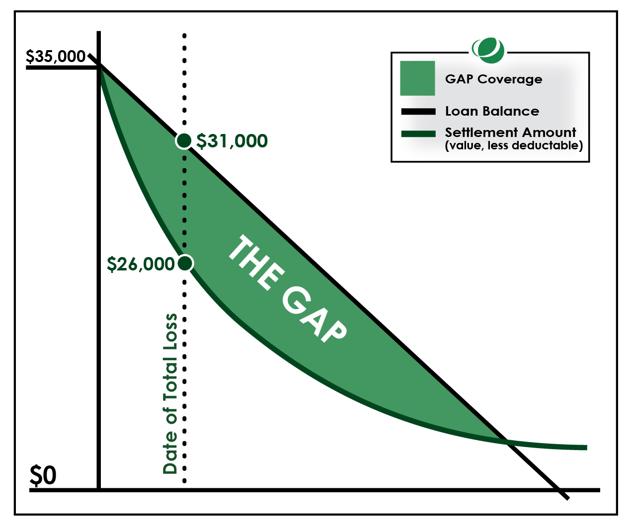 For example, if you owe $31,000 on the loan or lease of your vehicle and your insurance settlement value is $26,000 after your deductible of $1,000, you are left with a “gap” of $5,000 still owed on your vehicle.